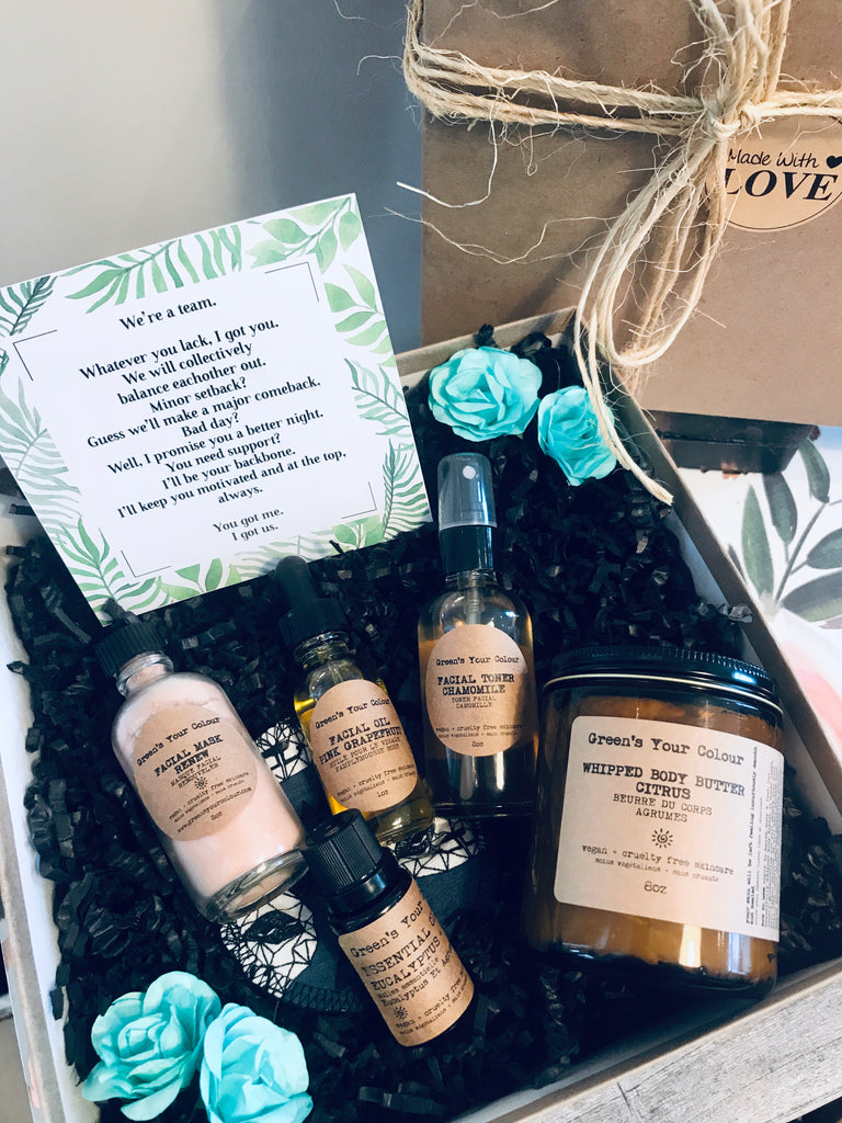 Our sustainable gift kit includes a vegan face toner, vegan face oil, vegan face mask, natural citrus body butter, pure grade A essential oil. Choose from our six greeting cards. Sustainably gift wrapped using brown kraft box, twine and includes paper made flowers.
