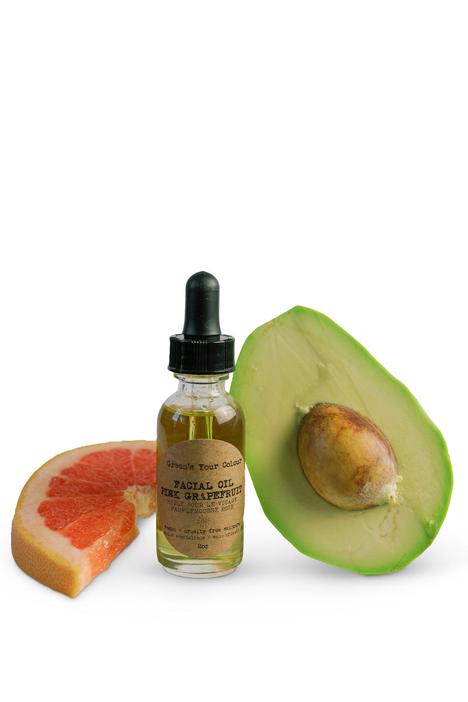 Facial oil pink grapefruit ingredients: Sweet almond oil, avocado oil, argan nut oil, jojoba seed oil, rosa canina rosehip fruit oil, hemp seed oil, camellia seed oil, grapefruit oil