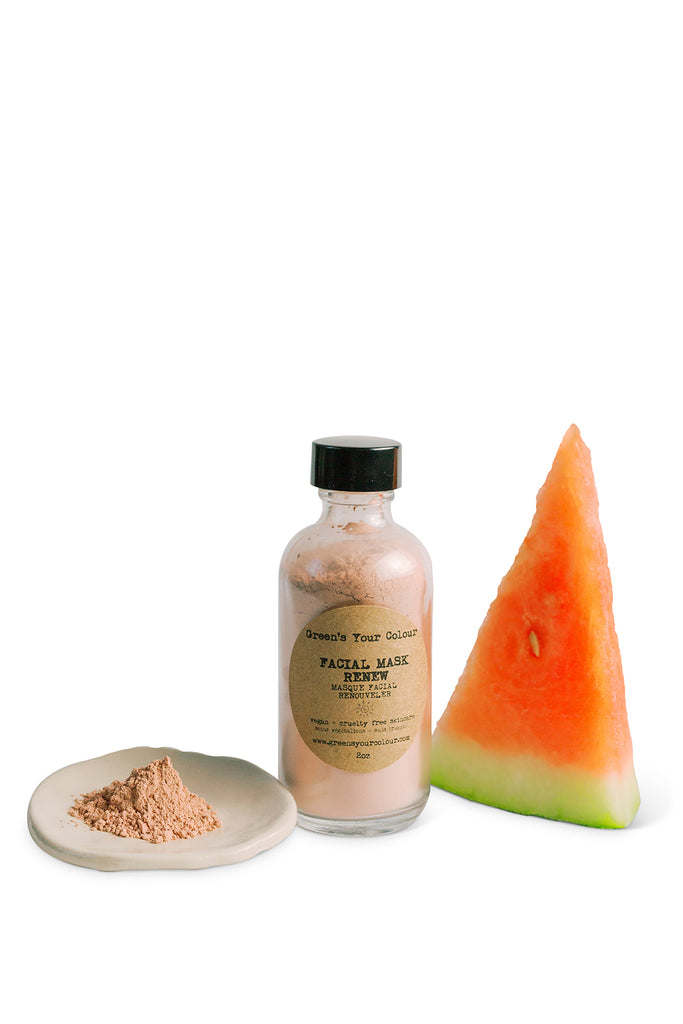 Facial mask renew ingredients: Kaolin french pink clay, bentonite clay, rosa casina rosehip seed powder, citrullus lanatus watermelon fruit extract